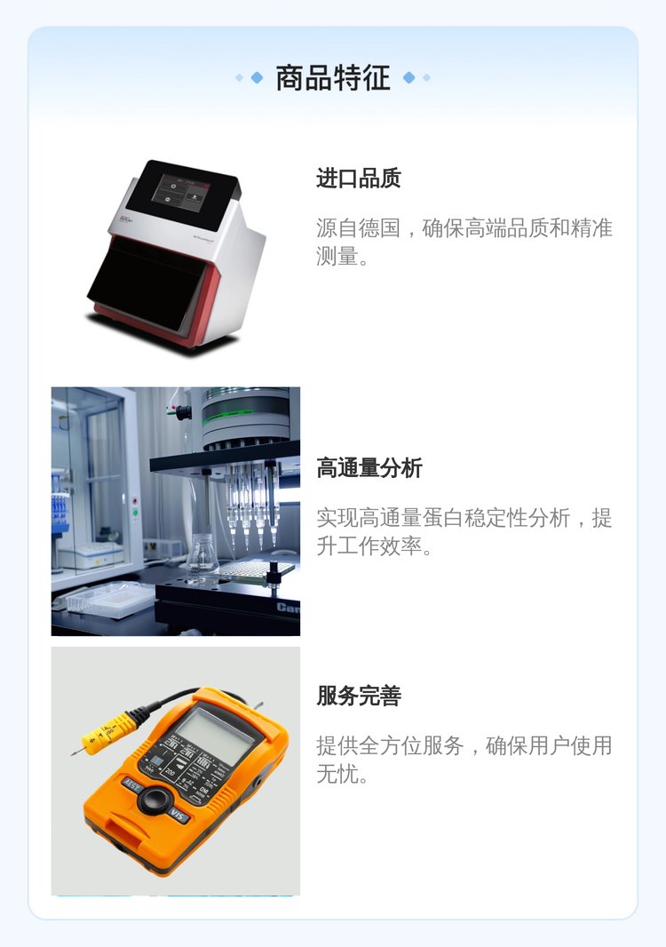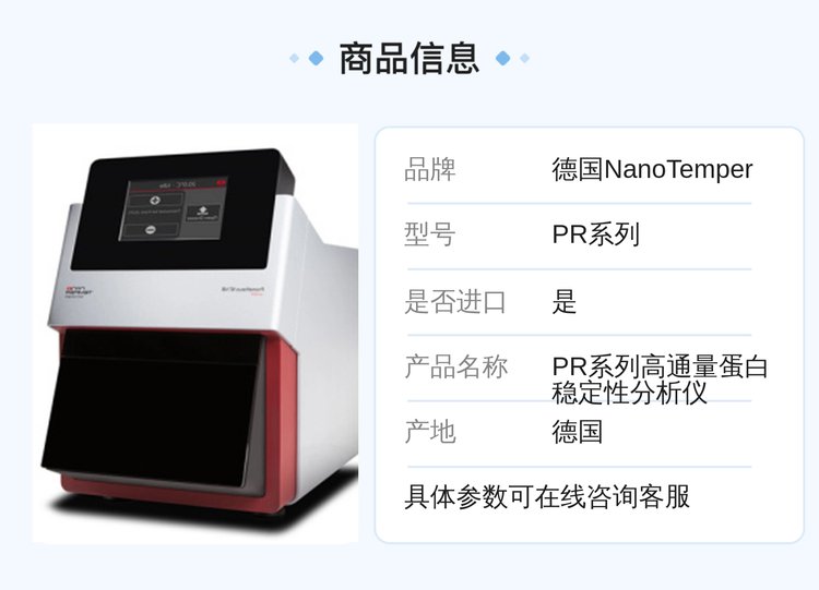 PR系列蛋白稳定性分析仪——精确表征蛋白稳定性的新黄金标准PR 系列仪器可精确测定蛋白的变性温度 (Tm 和 Tonset)、变性剂浓度 (Cm)、折叠自由能 (Δ G 和 ΔΔG) 以及蛋白形成聚集的起始温度 (Tagg),使您可以信心满满地为下游的每一个环节做出正确的决定。