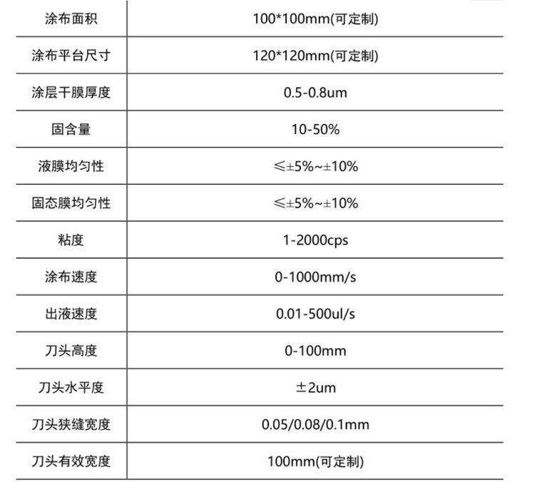 涂布系统主要包括供料单元和涂布单元,涂布单元是通过利用精密机械加工所制作的上下模及安装在上下模间的薄垫片所组成,供料单元由储料、输送的注射泵及过滤装置等组成。系统由涂布模具相对于基片作精确运动,通过控制速率、精密计量和泵送工艺流体,将液体化学材料从上下模之间的缝隙挤出涂布于移动的基板(玻璃、不锈钢和塑料等)。上形 成薄膜。涂膜厚度可由液体流量与基板移.动速度直接计算,其优点为涂膜均匀性高、可适用的涂料粘度范围广、涂布速度快、以及可制作大面积的涂膜。适用于有机太阳能电池0PV和钙钛矿太阳能电池PVK等基材的涂布,非连续基材如LCD玻璃基板光阻涂布,也应用于光学膜(增亮膜、hardcoat、 偏光膜、扩散膜等)、OLED 涂布等。多种规格尺寸可选可定制,多种人性化配置可选:加热台、特殊气体吹淋系统、多尺寸刀头,多规格垫片等,满足客户多种需求,为客户量身定制高精密专业设备。