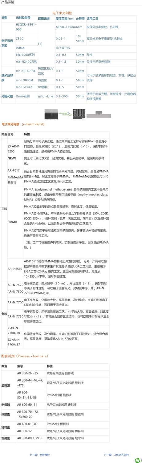 E-Beam 电子束光刻胶 :HSQXR-1541-006, Z520, PMMA, 。EBL6000系列,Ma-N2400系列。纳米压印胶:mr-NIL 6000E, mr-L 900M, mr-UVCur21。光固化胶:Ormo 系列。