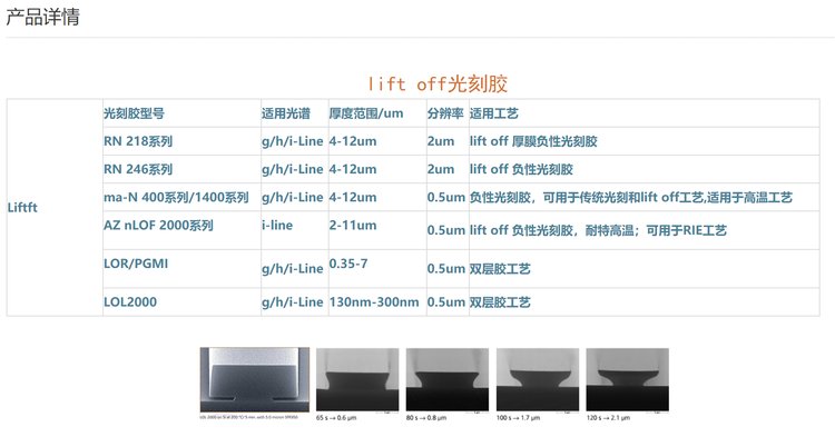 Lifft off光刻胶 : RN-218系列, RN-246系列,ma-N 400 系列/1400 系列,AZ nLOF 2000系列, LOR/PGMI, LOL 2000
