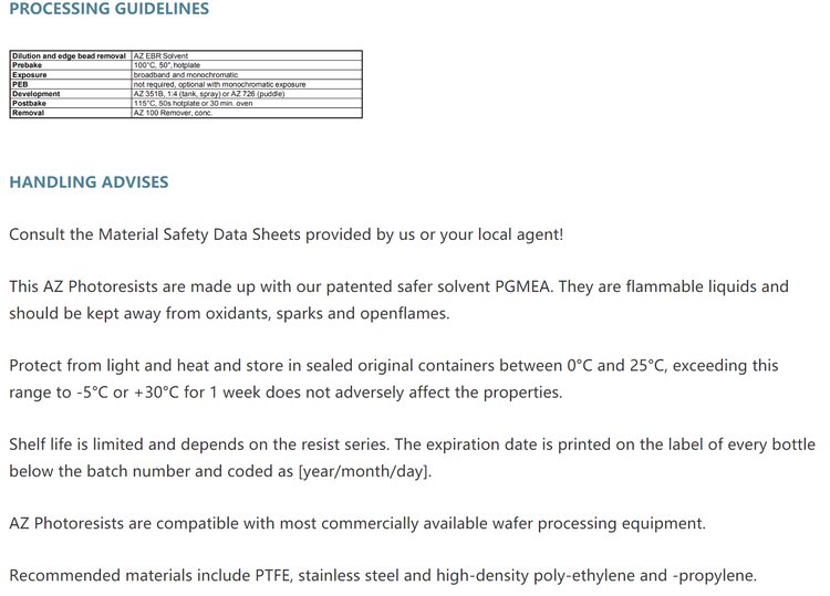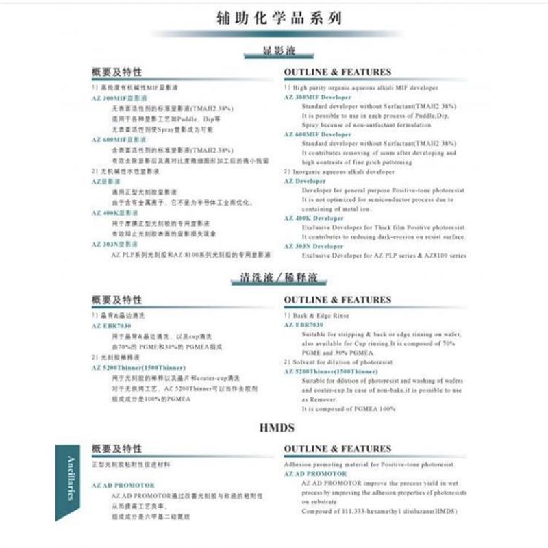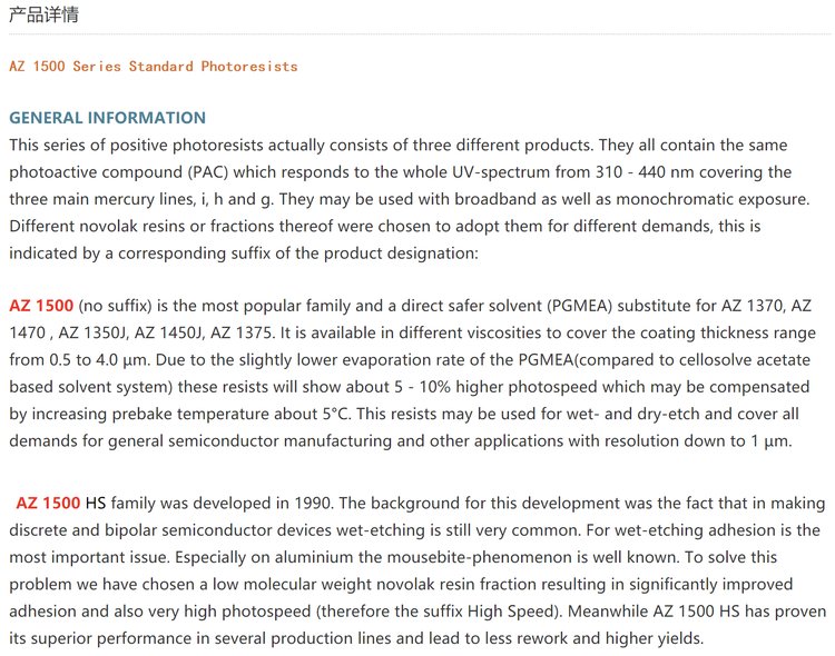 AZ 光刻胶 AZ1500 系列,其中型号AZ1500(1505,1518,1529,1514H,1512HS,1518HS)