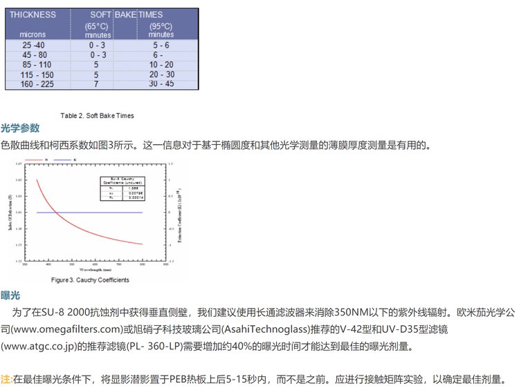 microchem 光刻胶SU-8 2000系列性环氧负性光刻胶:SU-8 2025,SU-8 2035,SU-8 2050,SU-8 2075,SU-8 2000是一种高对比度的环氧树脂基光刻胶,适用于微加工和其他微电子应用领域,需要厚、化学和热稳定的图像。SU-8 2000是SU-8的改进配方,多年来被MEMS生产厂家广泛使用。采用更快的干燥速度,更极性的溶剂体系,可改善涂层质量,提高工艺吞吐量。SU-8 2000有12种标准粘度可供选择。薄膜厚度0.5到>200微米,可以通过一个单一的涂层工艺实现。暴露的和随后的热交联部分的薄膜是不溶性的液体显影液。SU-8 2000具有良好的成像特性,能够产生非常高的展弦比结构。SU-8 2000在360纳米以上具有非常高的光学传输能力,这使得它非常适合在非常厚的薄膜中近垂直侧壁成像。SU-8 2000应用,它是成像,固化和留在设备上。