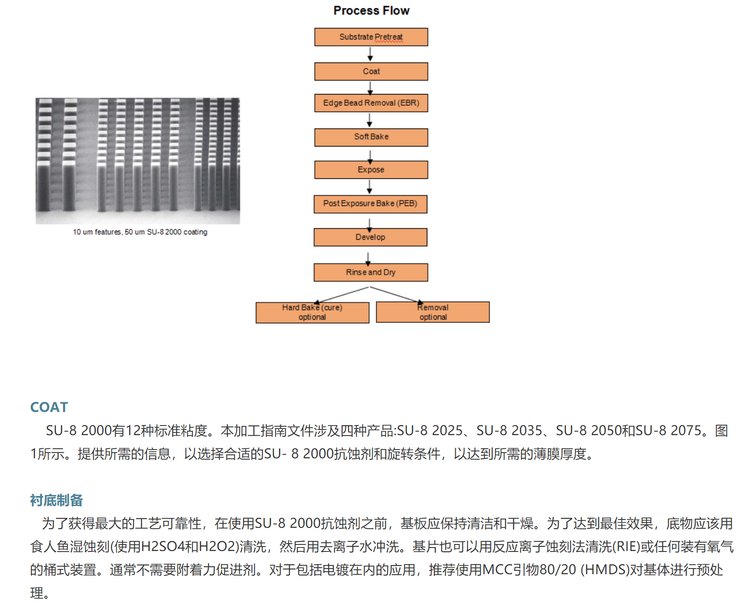 microchem光刻胶SU-82000性环氧负性光刻胶microchem光刻胶SU-82000系列性环氧负性光刻胶:SU-82025,SU-82035,SU-82050,SU-82075,SU-82000是一种高对比度的环氧树脂基光刻胶,适用于微加工和其他微电子应用领域,需要厚、化学和热稳定的图像