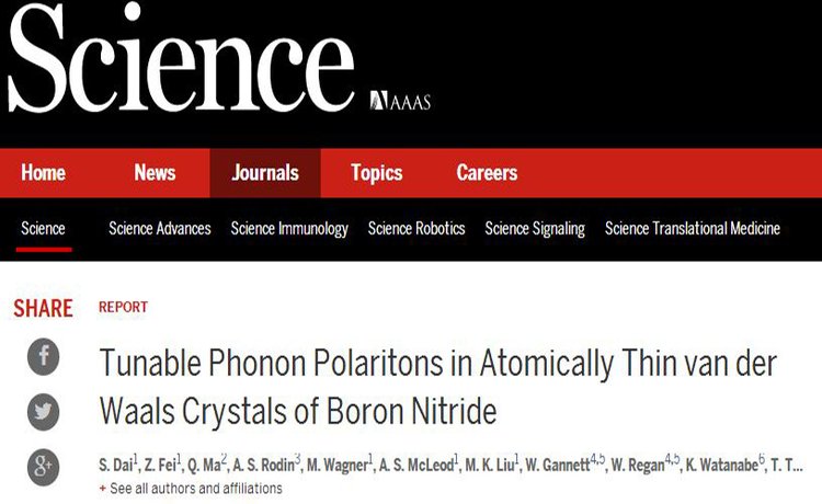 S.Dai等人利用Neaspec公司的纳米傅里叶红外光谱系统(Nano-FTIR)研究了不同厚度的薄 层氮化硼晶体中的声子极化激元(一种光子与光学声子的耦合作用)。结果表明,极化波的传播现象存在于氮化硼晶体表面,而且极化波的波长随着氮化硼晶体的厚度变化而变化。分析结果还可以得到表面声子极化激元色散特性关系。这些实验数据可以很好的与理论模型相吻合。与石墨烯相比,氮化硼晶体的损失因子要小很多,所以氮化硼晶体中表面声子波传播距离相对较大。