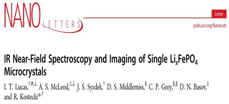 I. T.Lucas等人利用Neaspec公司的纳米傅里叶变换红外光谱技术(nano-FTIR)对磷酸铁锂在锂电池的充放电过程中的相位分布进行了具体的研究。根据对不同充放电阶段的正极材料红外吸收光谱的研究,实验结果直接证明,充放电的中间过程部分脱锂的正极材料同时存在磷酸铁锂与磷酸铁两种相位。通过建立三维层析成像的模型建立与分析,由磷酸铁组成的外壳包围由磷酸铁锂组成的核心的“外壳-核心结构"模型解释该实验所得结果。分析表明在脱锂的过程中,核心部分的磷酸铁锂慢慢的变小直至最终消失。