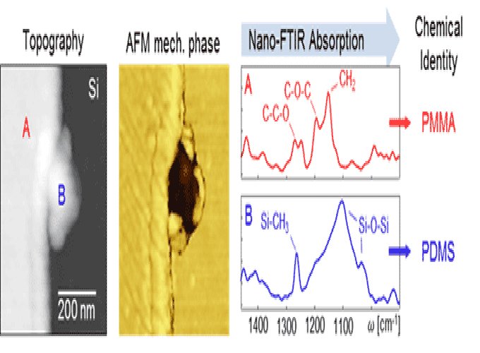 AFM表面形貌图像 (左), 在Si片基体(暗色区域B)与PMMA薄膜(A)之间可以观察到一个小的污染物。机械相位图像中(中),对比度变化证明该污染物的是有别于基体和薄膜的其他物质。将点A和B的nano-FTIR 吸收光谱(右),与标准红外光谱数据库对比, 获得各部分物质的化学成分信息. 每条谱线的采集时间为7min, 光谱分辨率为13 cm-1. ("Nano-FTIR absorption spectroscopy of molecular fingerprints at 20 nm spatial resolution ",F. Huth, A. Govyadinov, S. Amarie, W. Nuansing, F. Keilmann, R. Hillenbrand,)Nanoletters 12, p. 3973 (2012))