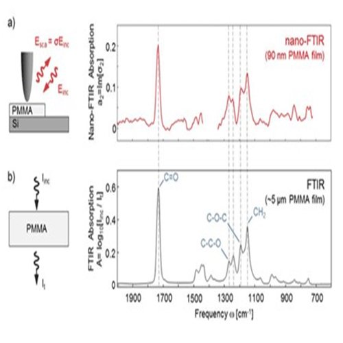 在不使用任何模型矫正的条件下,nano-FTIR获得的近场吸收光谱所体现的分子指纹特征与使用传统FTIR光谱仪获得的分子指纹特征吻合度(如下图),这在基础研究和实际应用方面都具有重要意义,因为研究者可以将nano-FTIR光谱与已经广泛建立的传统FTIR光谱数据库中的数据进行对比,从而实现快速准确的进行纳米尺度下的材料化学分析。对化学成分的高敏感度与超高的空间分辨率的结合,使得nano-FTIR成为纳米分析的工具。