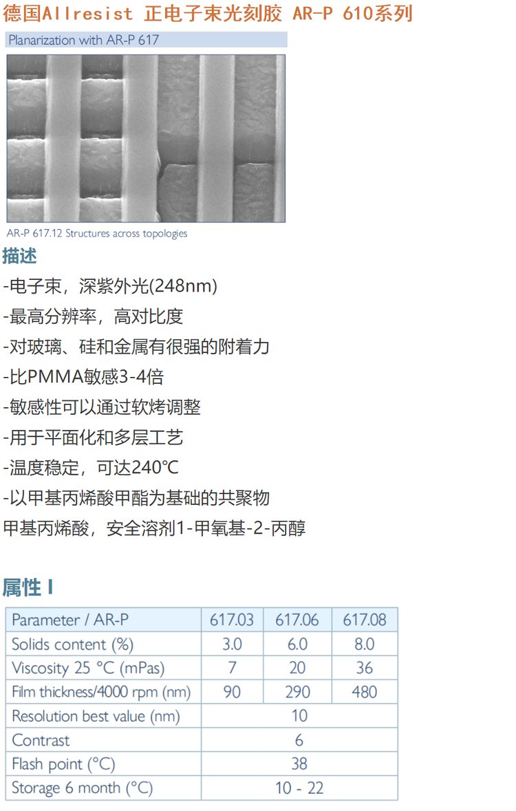 德国Allresist正电子束光刻胶德国Allresist正电子束光刻胶AR-P610系列,用于纳米光刻的AR-P617电子束电阻,共聚物抗蚀剂系列用于生产集成电路和掩模