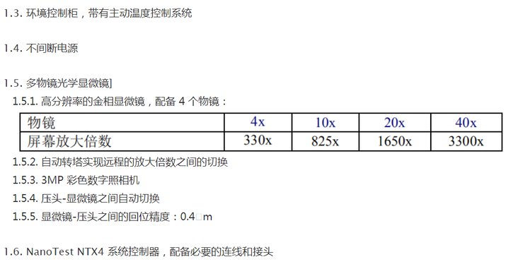 4.9. 兼容低载荷(纳米力学测量)和高载荷(微米力学测量),实现二者满载荷量程的测量。低载荷(纳米力学测量)和高载荷(微米力学测量)各配备一个专用的 Berkovich 金刚石压头。