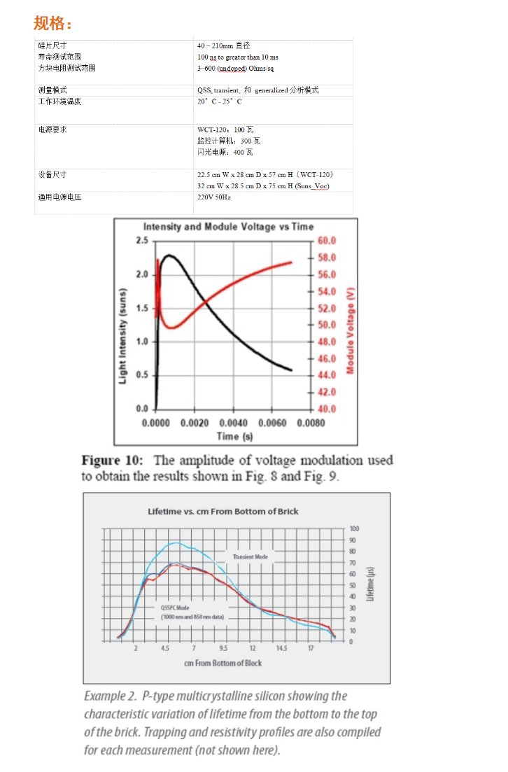 美国Sinton WCT-120少子寿命测试仪器采用了的测量和分析技术,包括准稳定态光电导(QSSPC)测量方法。可灵敏地反映单、多晶硅片的重金属污染及陷阱效应,表面复合效应等缺陷情况。WCT在大于20%的超高效率太阳能电池(HIT,MWT,EWT,PREL,等等)的研发和生产过程中是一种被广泛选用的检测工具。这种QSSPC测量少子寿命的方法可以在电池生产的中间任意阶段得到一个类似光照IV曲线的开路电压曲线,可以结合最后的IV曲线对电池制作过程进行数据监控和参数优化。