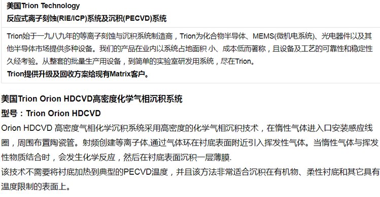 我的位置:首页 > 产品中心 > 电子元器件 > 五金/焊接/辅料/返修工具 > 美国Trion 高密度化学气相沉积系统 Orion HDCVD 产品关键词:cvd沉积系统;cvd化学气相沉积系统;气相沉积系统;化学气相沉积公司;化学沉积系统