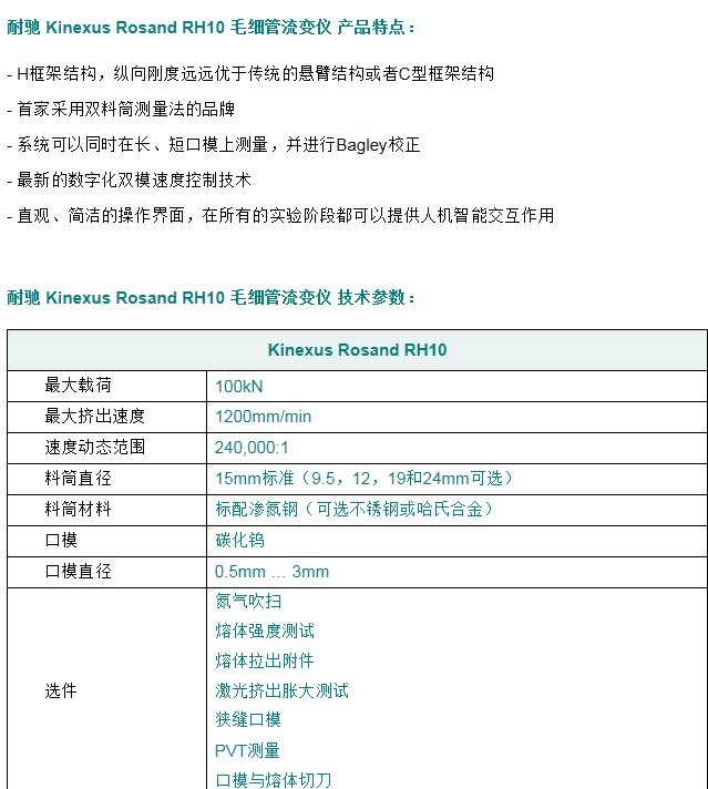 KinexusRosandRH10毛细管流变仪耐驰KinexusRosandRH10毛细管流变仪应用领域:-评价不同剪切速率和温度下聚合物或者悬浮液的流变特性-模拟拉伸粘度主导的工艺过程