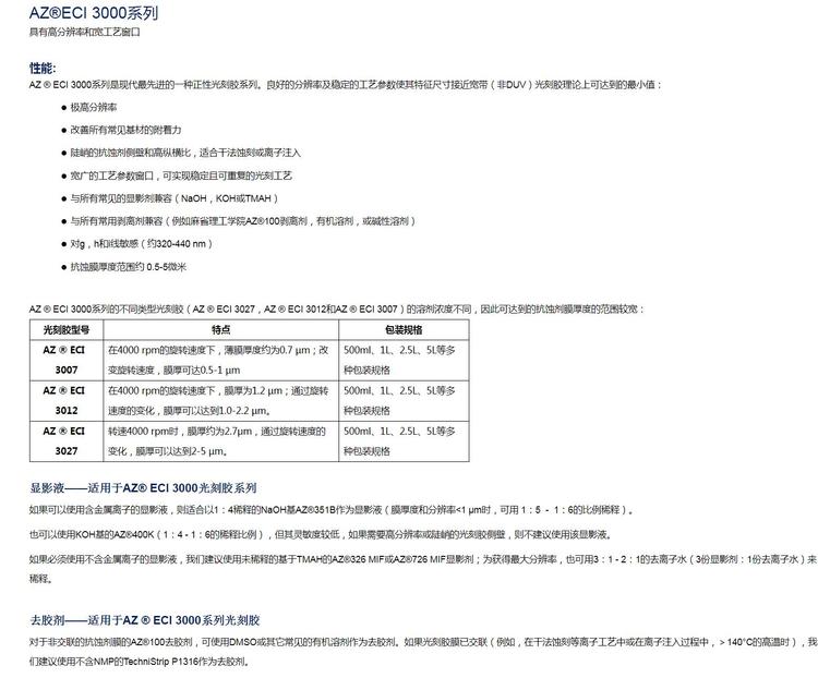 安智AZ 正性光刻胶薄胶 ECI 3000系列