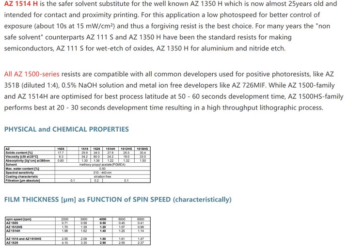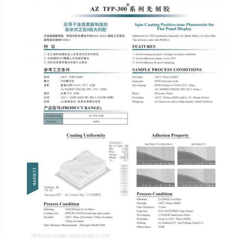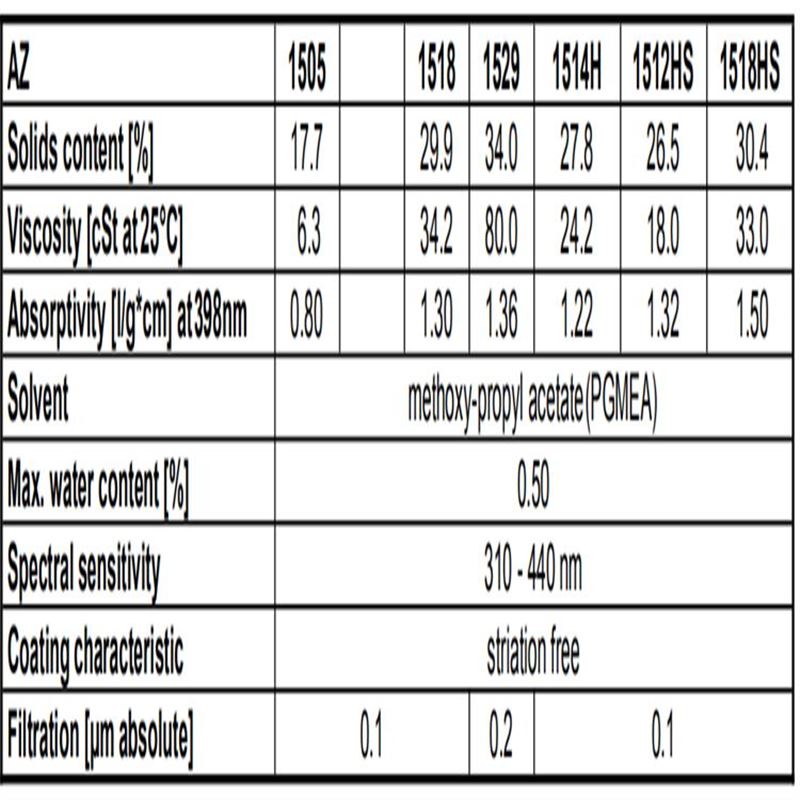 AZ 光刻胶 AZ1500 系列,其中型号AZ1500(1505,1518,1529,1514H,1512HS,1518HS)