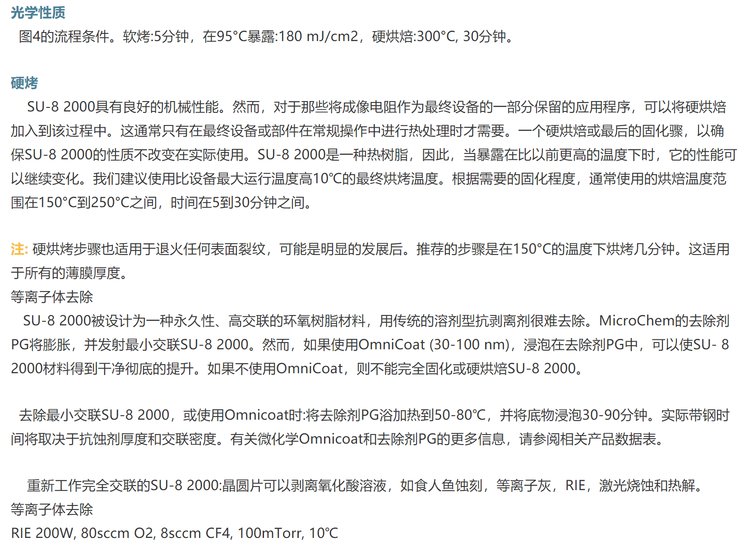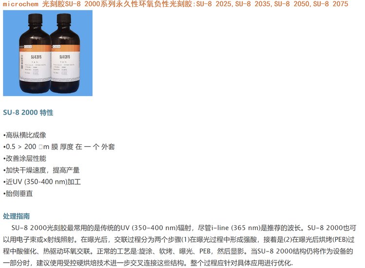 microchem光刻胶SU-82000性环氧负性光刻胶microchem光刻胶SU-82000系列性环氧负性光刻胶:SU-82025,SU-82035,SU-82050,SU-82075,SU-82000是一种高对比度的环氧树脂基光刻胶,适用于微加工和其他微电子应用领域,需要厚、化学和热稳定的图像