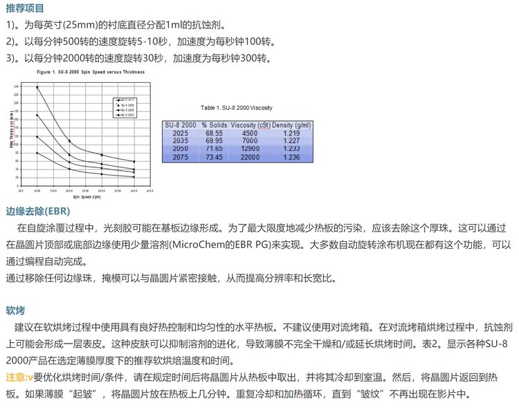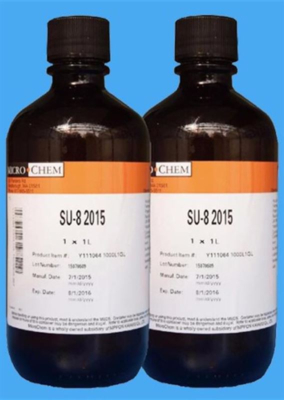microchem 光刻胶SU-8 2000系列性环氧负性光刻胶:SU-8 2025,SU-8 2035,SU-8 2050,SU-8 2075,SU-8 2000是一种高对比度的环氧树脂基光刻胶,适用于微加工和其他微电子应用领域,需要厚、化学和热稳定的图像。SU-8 2000是SU-8的改进配方,多年来被MEMS生产厂家广泛使用。采用更快的干燥速度,更极性的溶剂体系,可改善涂层质量,提高工艺吞吐量。SU-8 2000有12种标准粘度可供选择。薄膜厚度0.5到>200微米,可以通过一个单一的涂层工艺实现。暴露的和随后的热交联部分的薄膜是不溶性的液体显影液。SU-8 2000具有良好的成像特性,能够产生非常高的展弦比结构。SU-8 2000在360纳米以上具有非常高的光学传输能力,这使得它非常适合在非常厚的薄膜中近垂直侧壁成像。SU-8 2000应用,它是成像,固化和留在设备上。
